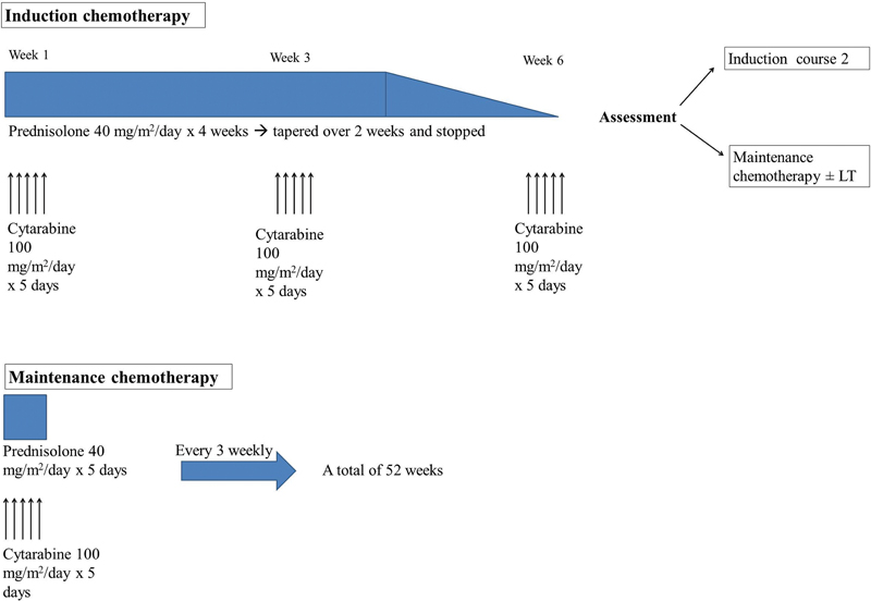 Children in our study received modified low-dose cytarabine-based chemotherapy.[12] [13] [14] The induction regimen included cytarabine administered at a dosage of 100 mg/m2 per day. The administration was carried out either through intravenous infusion over 1 hour or via subcutaneous delivery. The treatment spanned 5 consecutive days every 3 weeks. This was combined with daily prednisolone at a dose of 40 mg/m2 for 4 weeks, followed by gradual tapering over the subsequent 2 weeks. Subsequently, the treatment response was assessed at 6 and 12 weeks. Induction chemotherapy was continued until complete remission or 12 weeks, whichever was earlier, as long as there was no progression of the disease. After induction, maintenance chemotherapy commenced. It involved three weekly doses of cytarabine at a dose of 100 mg/m2 for 5 days, along with prednisolone at 40 mg/m2/d for 5 days. Likewise, the total duration of treatment spanned 52 weeks ([Fig. 1]).