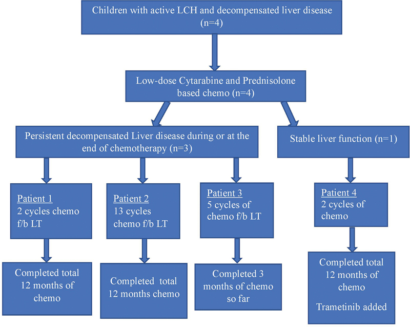 Fig. 2 Flowchart depicting the status of the liver disease and treatment received by the children. f/b = followed by; LT = liver transplantation; chemo = chemotherapy.