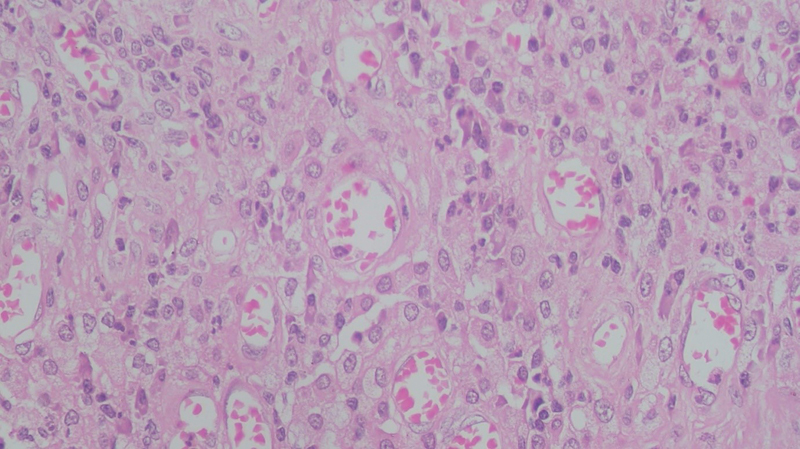 The gross appearance of the specimens may show cystic degeneration, foci of necrosis, and hemorrhage, in grossly enlarged ovary. The microscopic examination shows the presence of foamy histiocytes, along with a mixture of inflammatory cells like lymphocytes, plasma cells, and occasional neutrophils.[21] Foamy histiocytes, the so-called “xanthoma cells,” are histiocytes with abundant lipid-laden cytoplasm having a vacuolated appearance. These impart the yellowish color to the specimen, when seen on the gross examination. There is no cellular atypia, abnormal mitoses, or any other microscopic feature suggestive of malignancy.