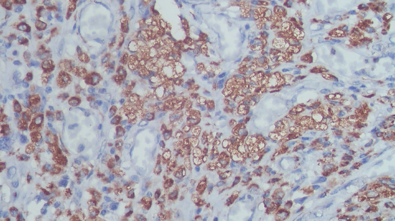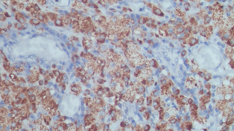 | Fig. 5 The foamy histiocytes show positivity by immunostaining with CD68. (CD68 antibody staining; magnification 400x).